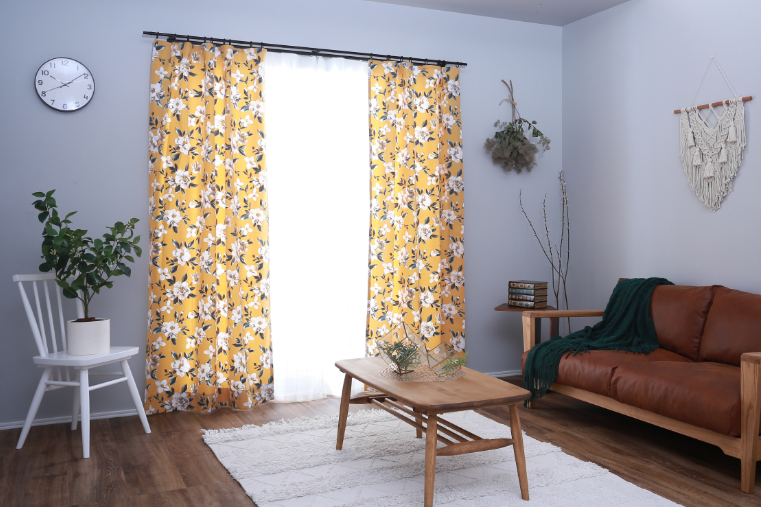 懐かしい花模様を引き立たせるため、掠れたテクスチャーの床、ブラウンレザーのソファ、どこか懐かしさの感じるリビングテーブルで雰囲気を出しました。カーテンの白い花柄とカラーを合わせた白い椅子が明るさを演出しています。