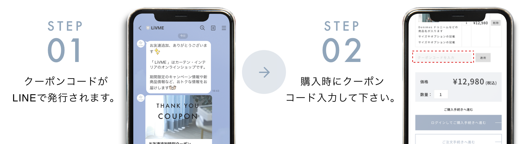 - LiVMEの公式LINEを友だち追加し、LINEで発行されるクーポンコードを購入時にご入力ください。